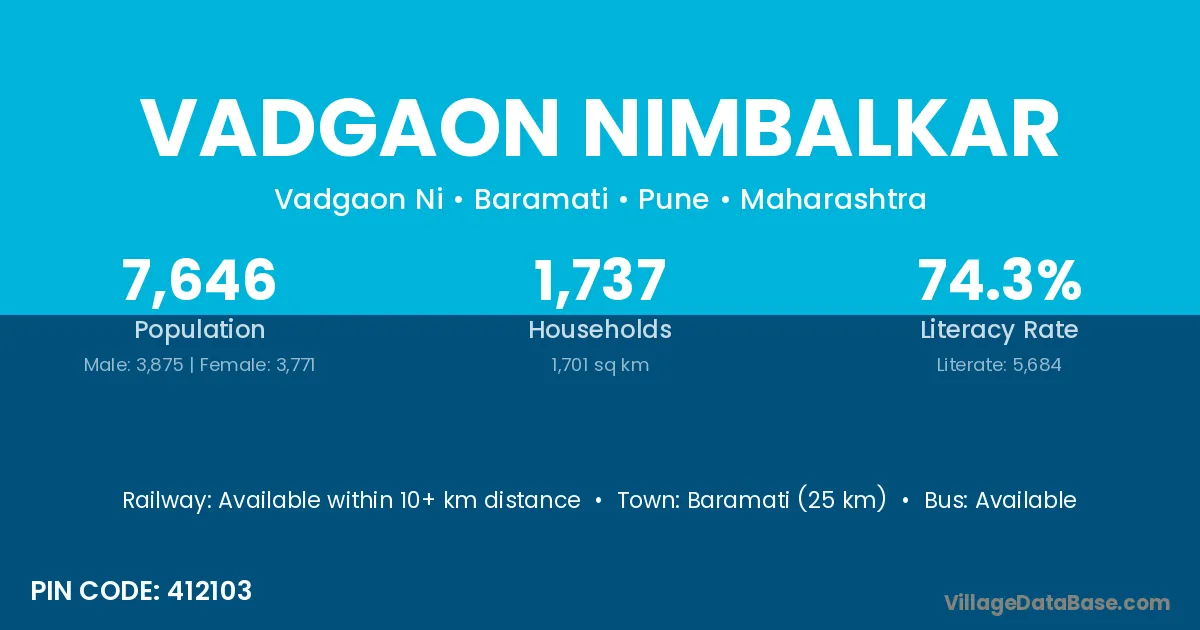 Baramati (25 km) is the nearest town to Vadgaon Nimbalkar village for major economic activities and is located approximately 25 km away.