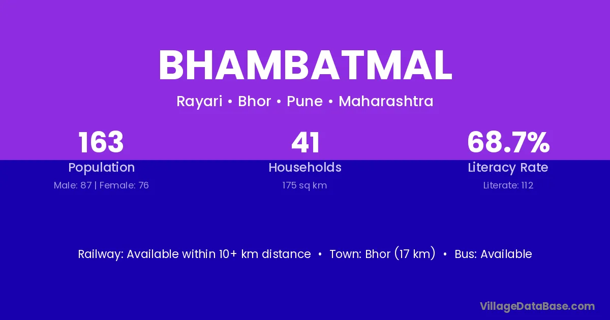 Bhor (17 km) is the nearest town to Bhambatmal village for major economic activities and is located approximately 17 km away.