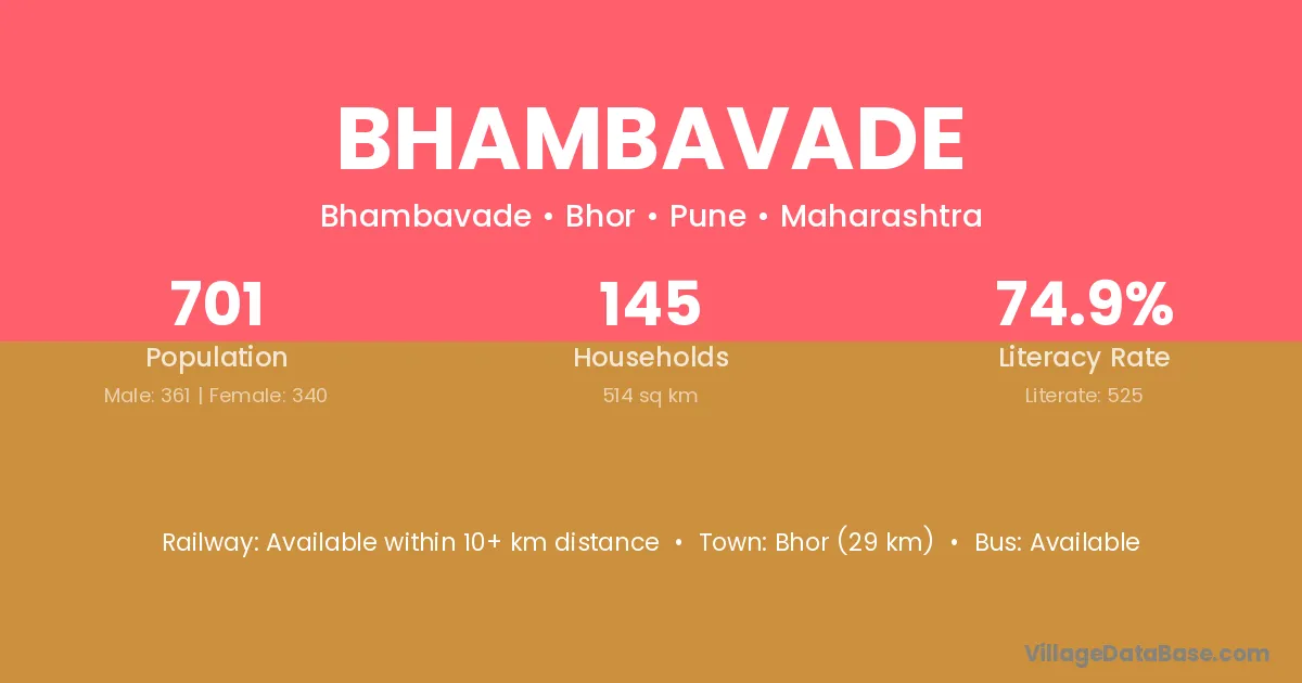 Bhor (29 km) is the nearest town to Bhambavade village for major economic activities and is located approximately 29 km away.