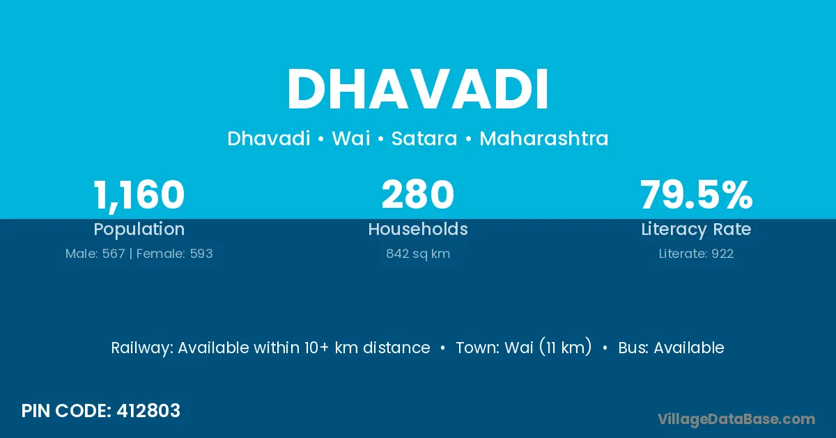 Bhor (7 km) is the nearest town to Dhavadi village for major economic activities and is located approximately 7 km away.