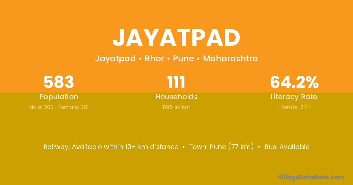 Pune (77 km) is the nearest town to Jayatpad village for major economic activities and is located approximately 77 km away.