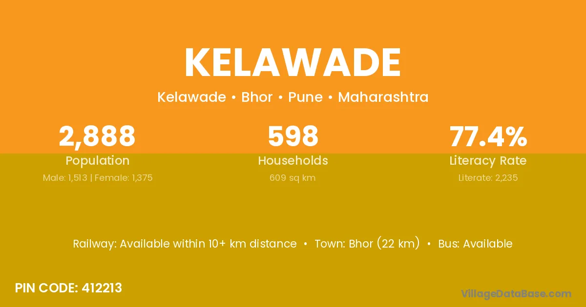 Bhor (22 km) is the nearest town to Kelawade village for major economic activities and is located approximately 22 km away.