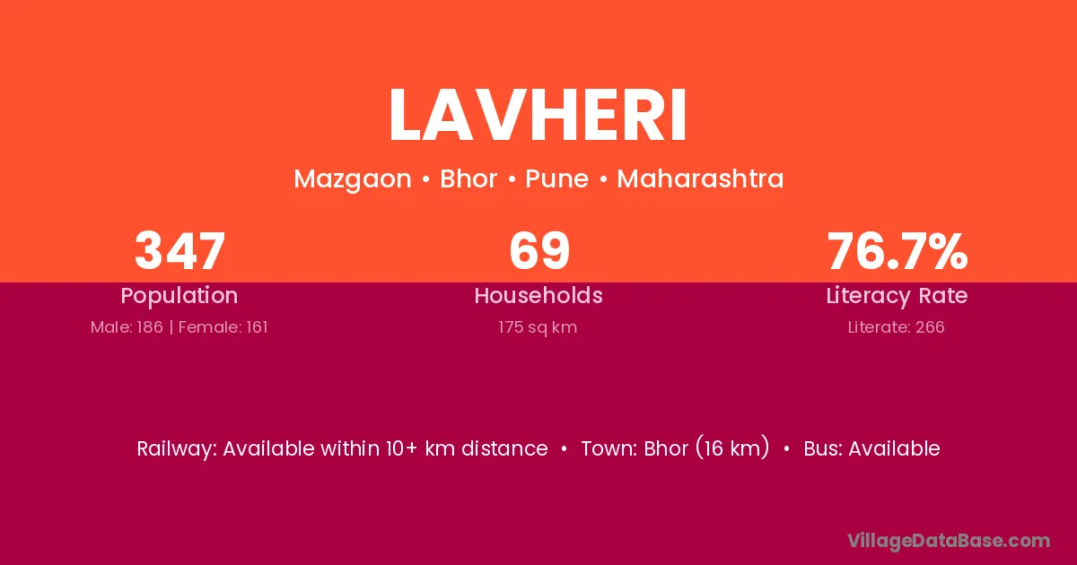 Bhor (16 km) is the nearest town to Lavheri village for major economic activities and is located approximately 16 km away.