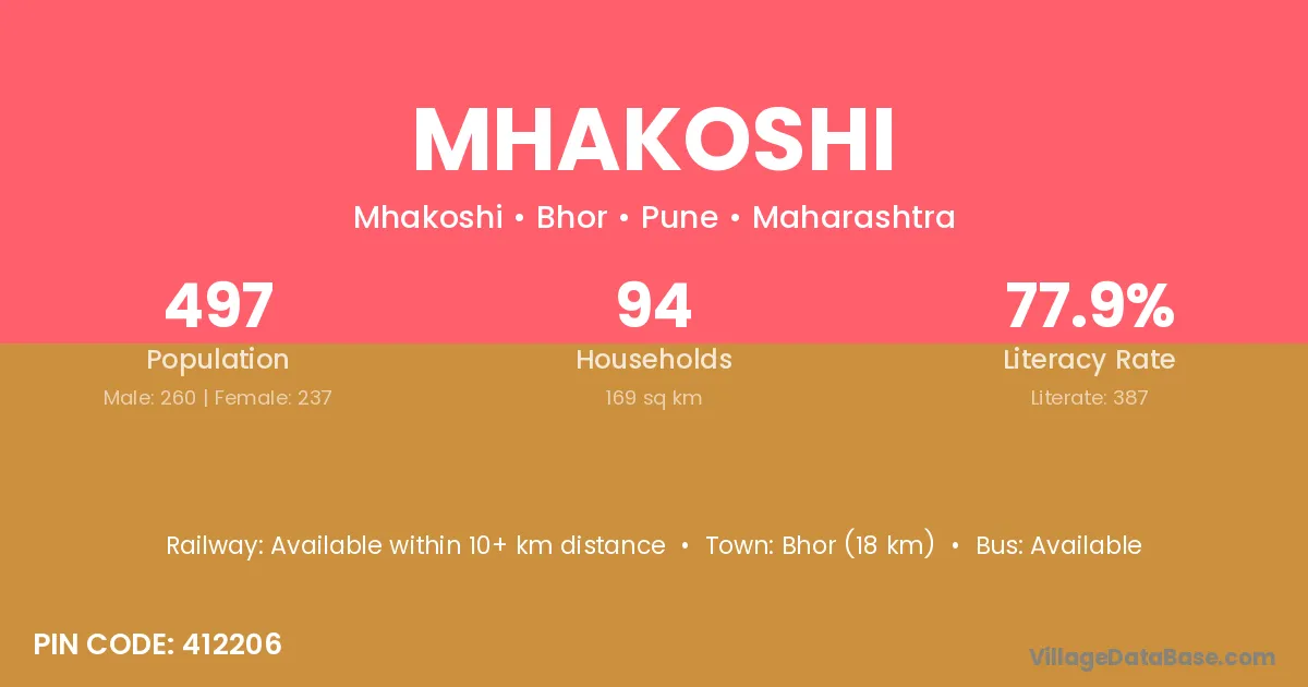 Bhor (18 km) is the nearest town to Mhakoshi village for major economic activities and is located approximately 18 km away.