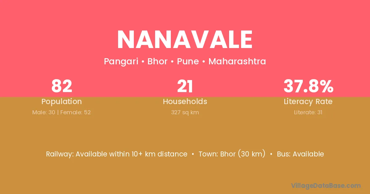 Bhor (30 km) is the nearest town to Nanavale village for major economic activities and is located approximately 30 km away.