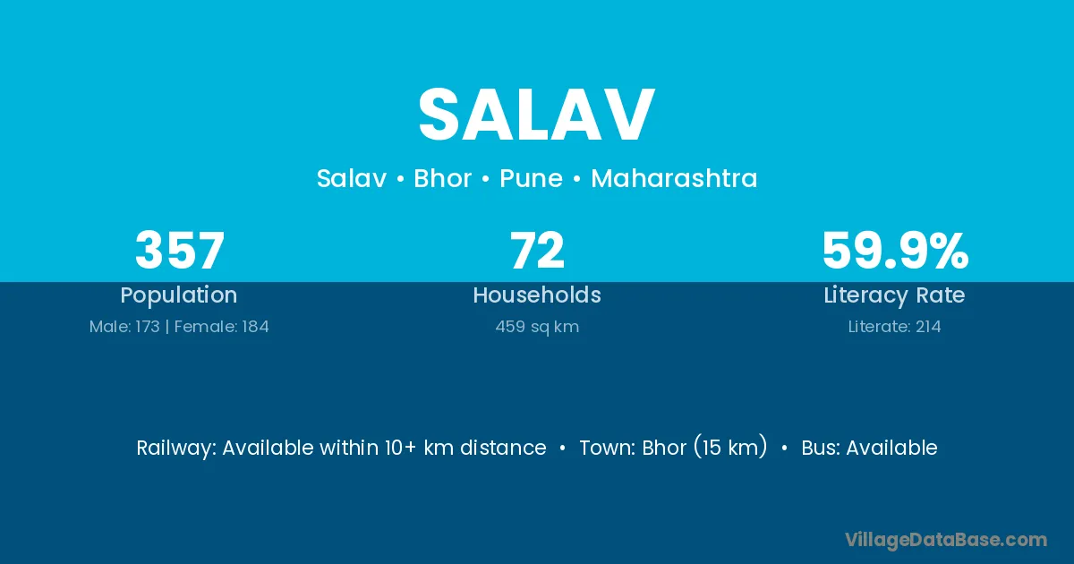 Bhor (15 km) is the nearest town to Salav village for major economic activities and is located approximately 15 km away.
