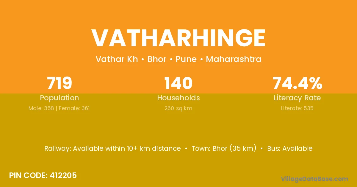 Bhor (35 km) is the nearest town to Vatharhinge village for major economic activities and is located approximately 35 km away.