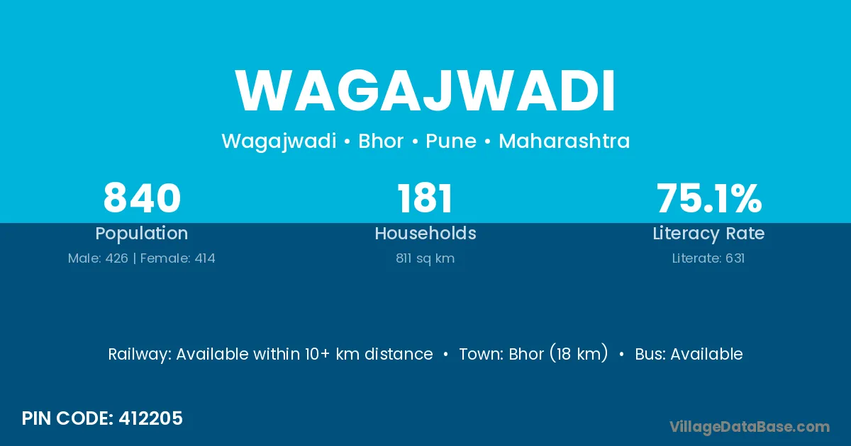 Bhor (18 km) is the nearest town to Wagajwadi village for major economic activities and is located approximately 18 km away.