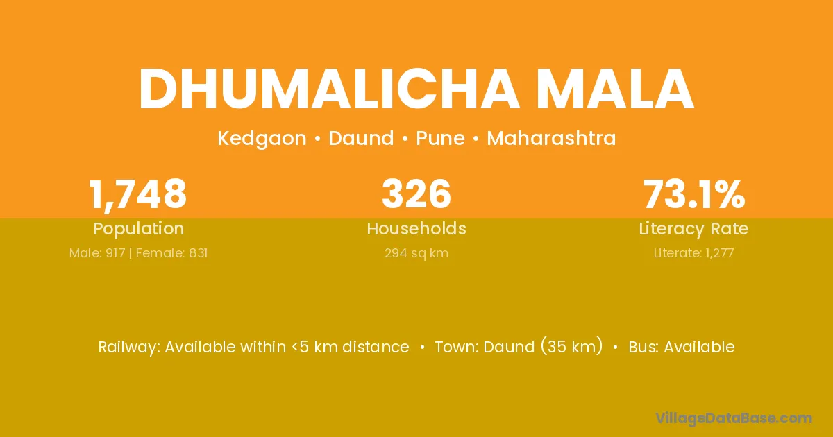 Daund (35 km) is the nearest town to Dhumalicha Mala village for major economic activities and is located approximately 35 km away.