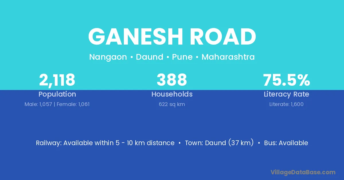 Daund (37 km) is the nearest town to Ganesh Road village for major economic activities and is located approximately 37 km away.