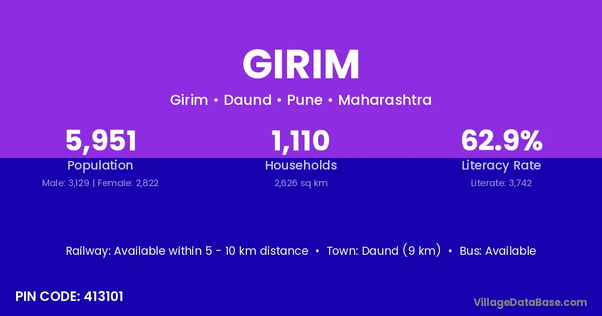 Daund (9 km) is the nearest town to Girim village for major economic activities and is located approximately 9 km away.