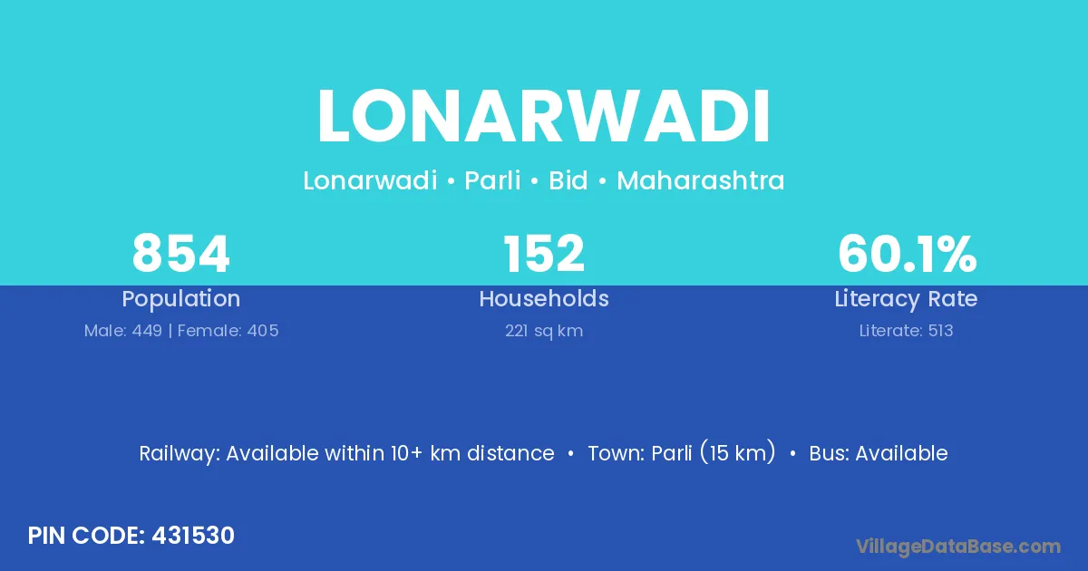 The literacy rate of Lonarwadi village is 66.08%. Male literacy stands at 71.68% and female literacy at 59.65%.