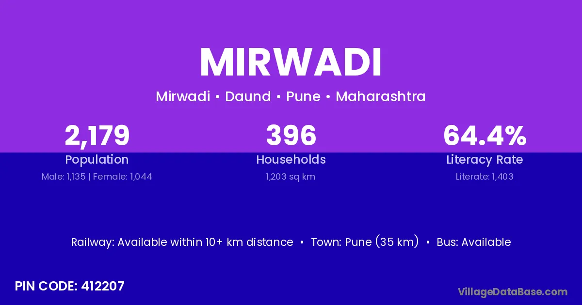 Pune (35 km) is the nearest town to Mirwadi village for major economic activities and is located approximately 35 km away.