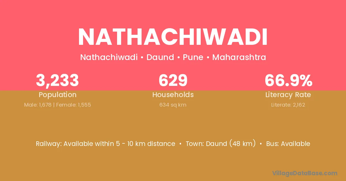 Daund (48 km) is the nearest town to Nathachiwadi village for major economic activities and is located approximately 48 km away.