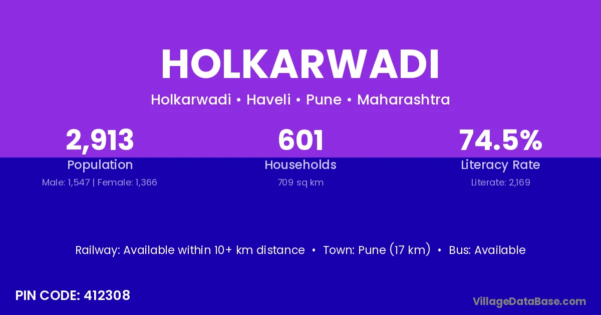 Pune (17 km) is the nearest town to Holkarwadi village for major economic activities and is located approximately 17 km away.