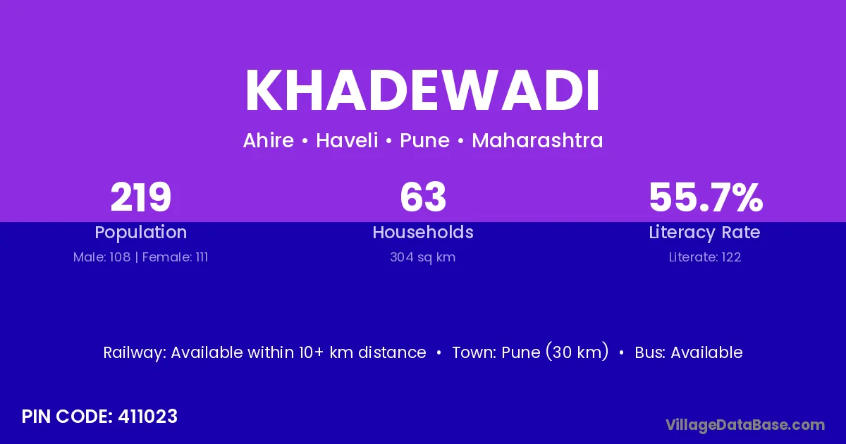 Pune (30 km) is the nearest town to Khadewadi village for major economic activities and is located approximately 30 km away.