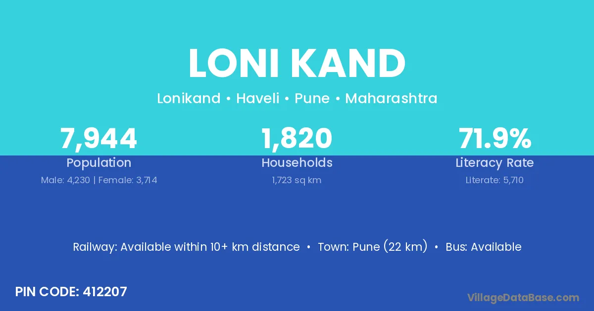 Pune (22 km) is the nearest town to Loni Kand village for major economic activities and is located approximately 22 km away.