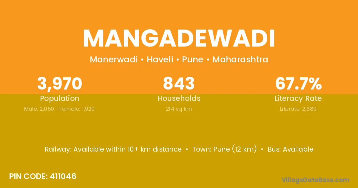 Mangadewadi village has a total population of 3,970 people, of which 2,050 are males and 1,920 are females.