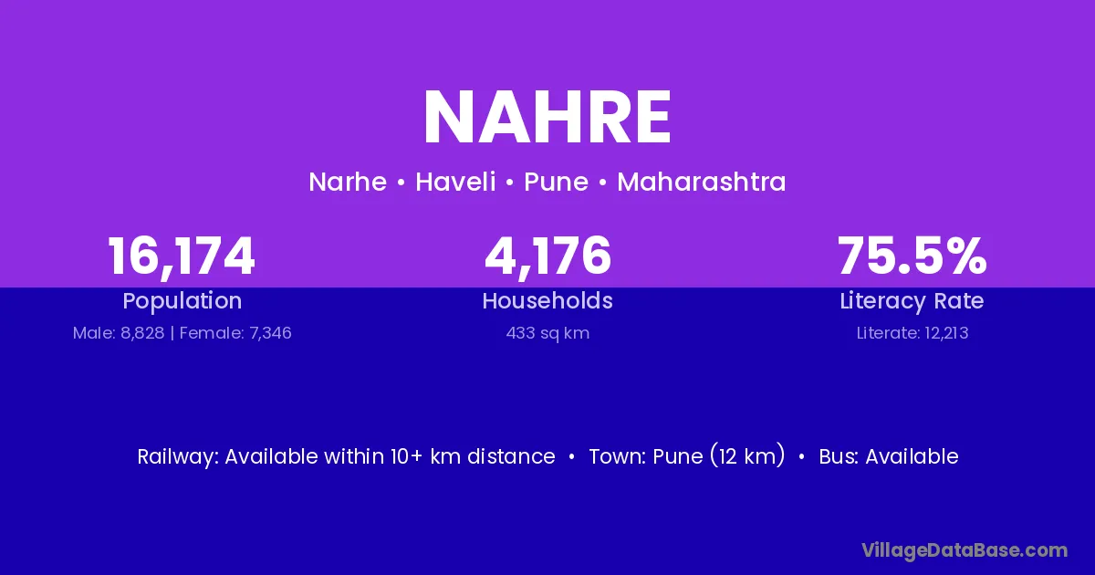 Pune (12 km) is the nearest town to Nahre village for major economic activities and is located approximately 12 km away.