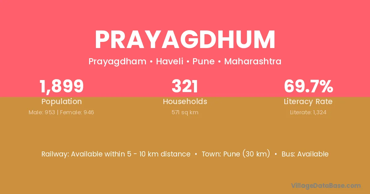 Pune (30 km) is the nearest town to Prayagdhum village for major economic activities and is located approximately 30 km away.