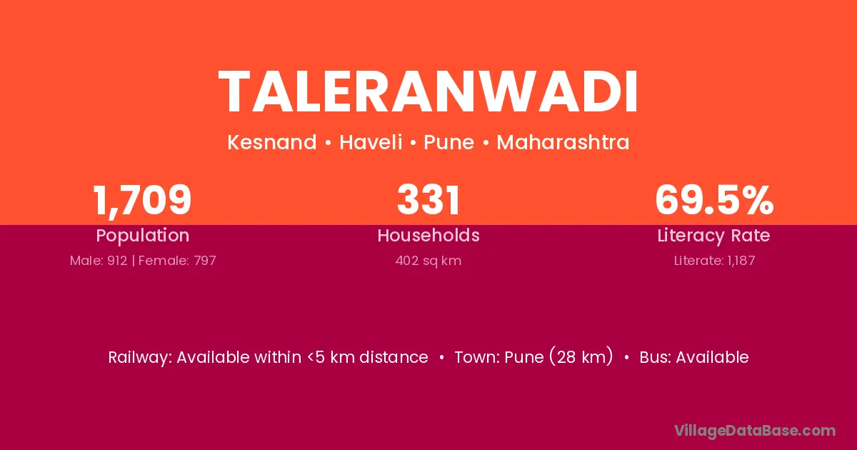 Pune (28 km) is the nearest town to Taleranwadi village for major economic activities and is located approximately 28 km away.
