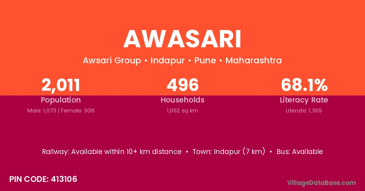 Indapur (7 km) is the nearest town to Awasari village for major economic activities and is located approximately 7 km away.
