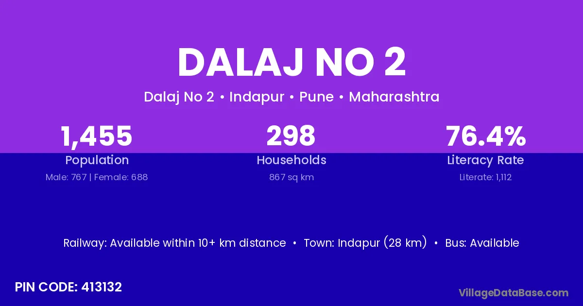 Indapur (28 km) is the nearest town to Dalaj No 2 village for major economic activities and is located approximately 28 km away.