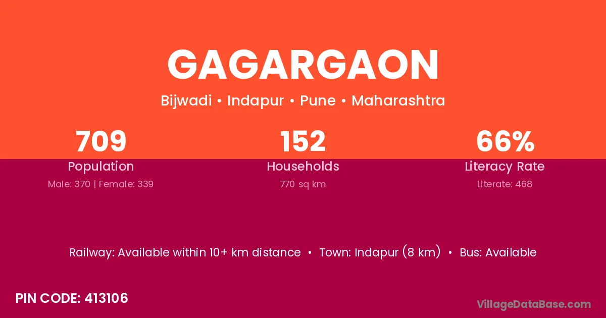 Indapur (8 km) is the nearest town to Gagargaon village for major economic activities and is located approximately 8 km away.