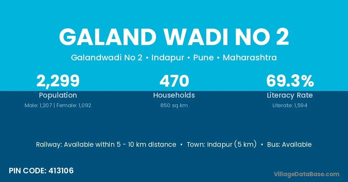 Indapur (5 km) is the nearest town to Galand Wadi No 2 village for major economic activities and is located approximately 5 km away.