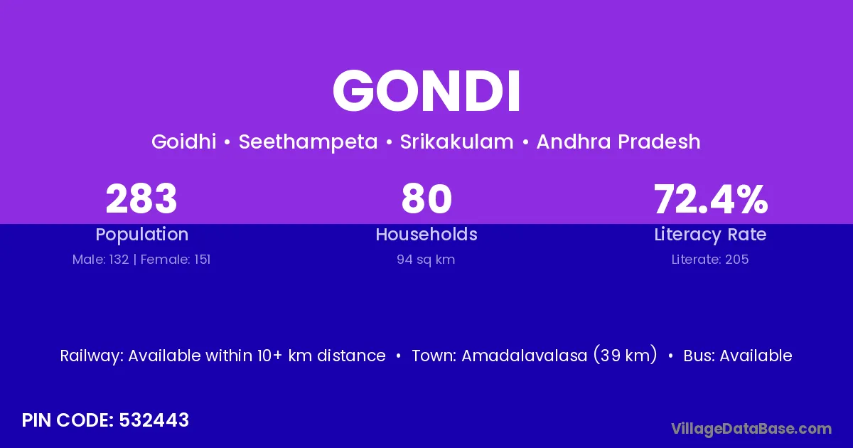 The literacy rate of Gondi village is 67.03%. Male literacy stands at 73.16% and female literacy at 60.26%.