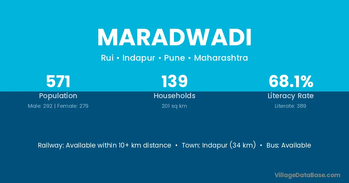Indapur (34 km) is the nearest town to Maradwadi village for major economic activities and is located approximately 34 km away.