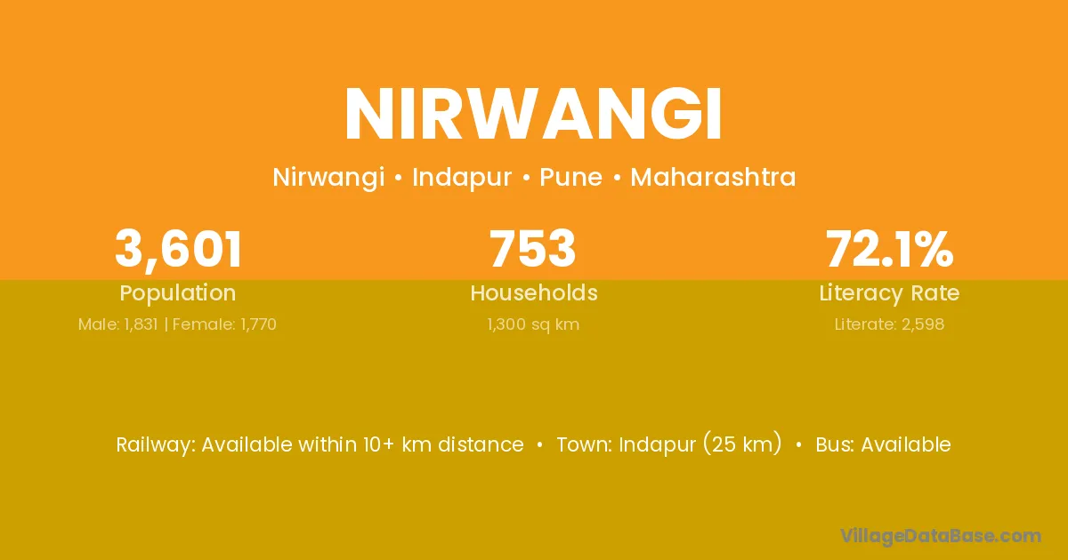 Indapur (25 km) is the nearest town to Nirwangi village for major economic activities and is located approximately 25 km away.
