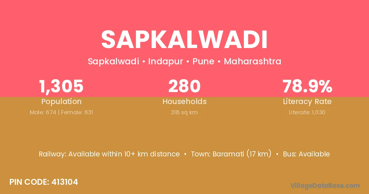 Sapkalwadi village has a total population of 1,305 people, of which 674 are males and 631 are females.