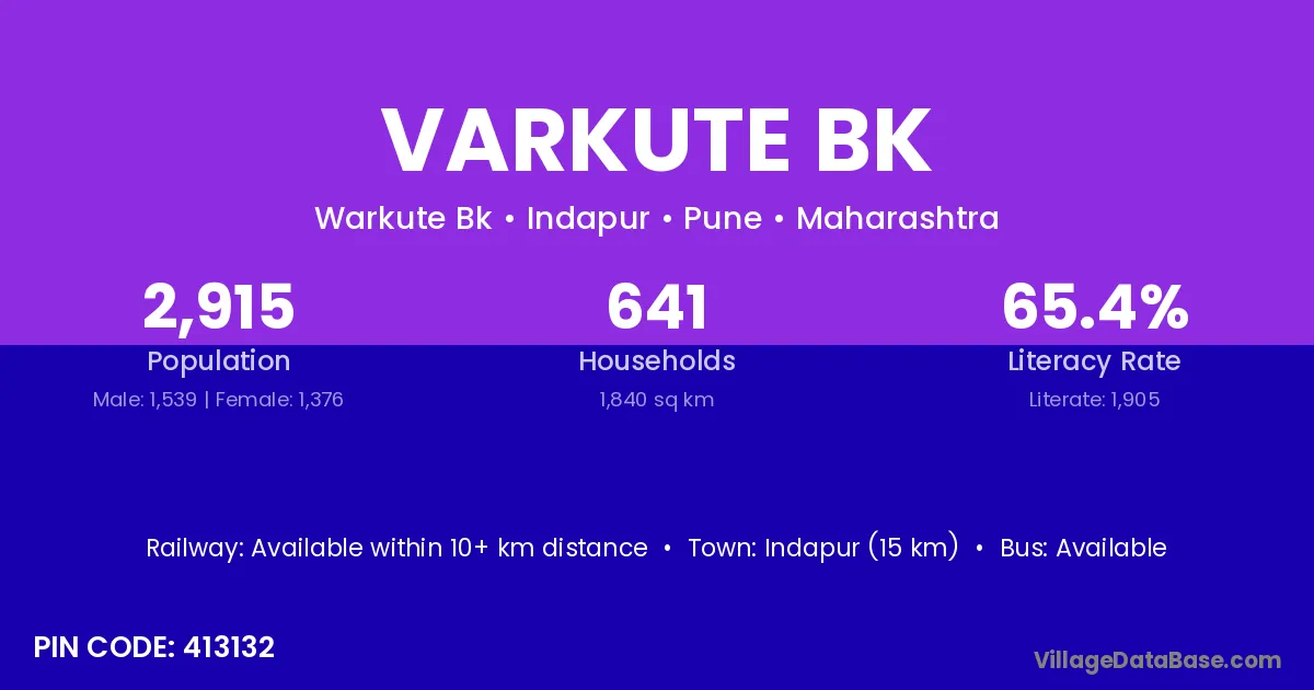 Indapur (15 km) is the nearest town to Varkute Bk village for major economic activities and is located approximately 15 km away.