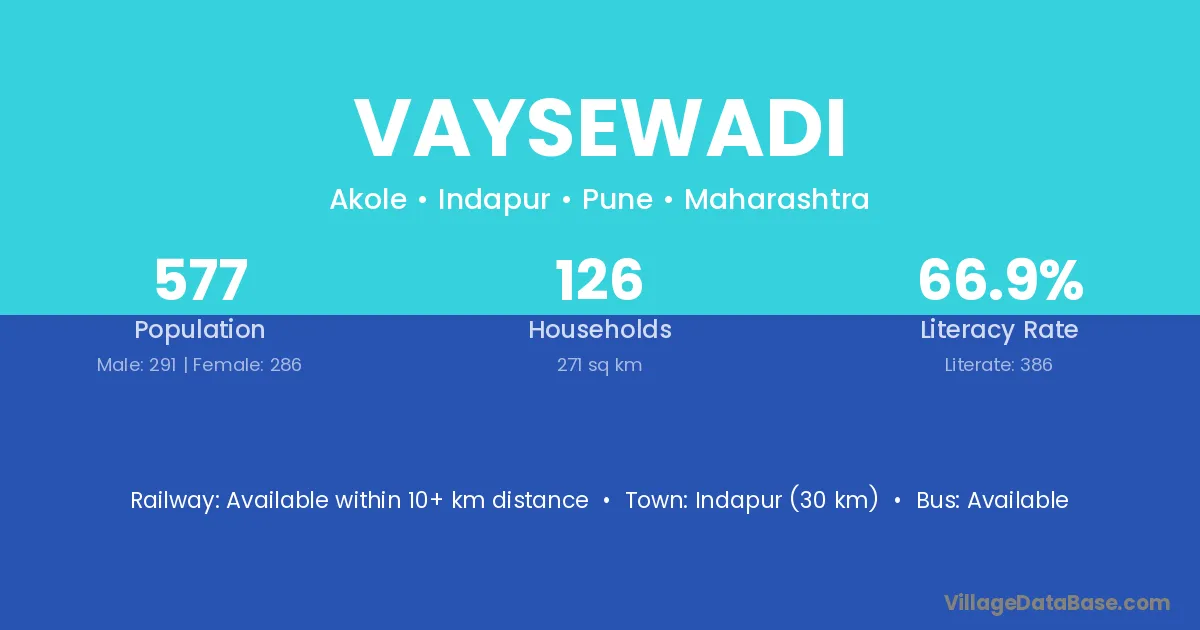 Vaysewadi village has a total population of 577 people, of which 291 are males and 286 are females.