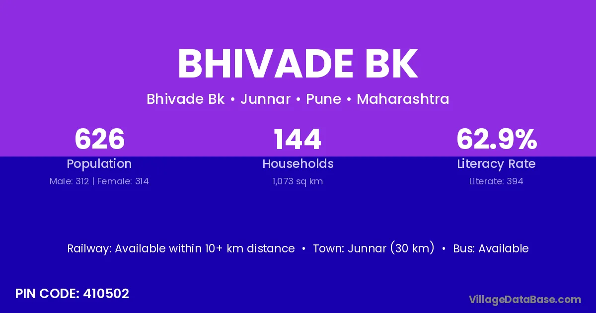 Bhivade Bk village has a total population of 626 people, of which 312 are males and 314 are females.