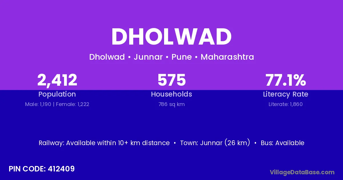 Junnar (26 km) is the nearest town to Dholwad village for major economic activities and is located approximately 26 km away.