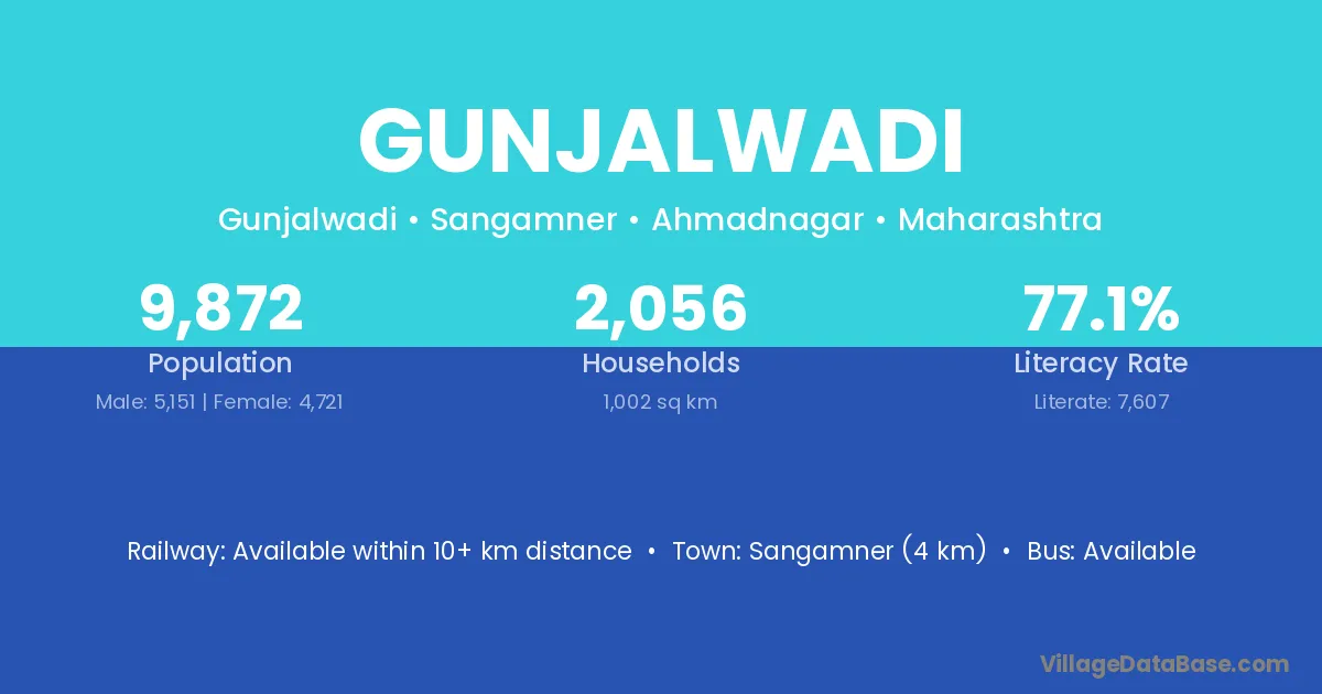 Junnar (13 km) is the nearest town to Gunjalwadi village for major economic activities and is located approximately 13 km away.