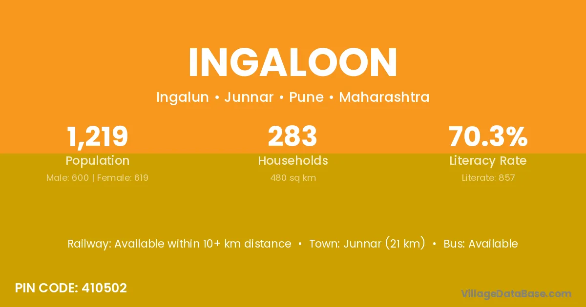 Junnar (21 km) is the nearest town to Ingaloon village for major economic activities and is located approximately 21 km away.