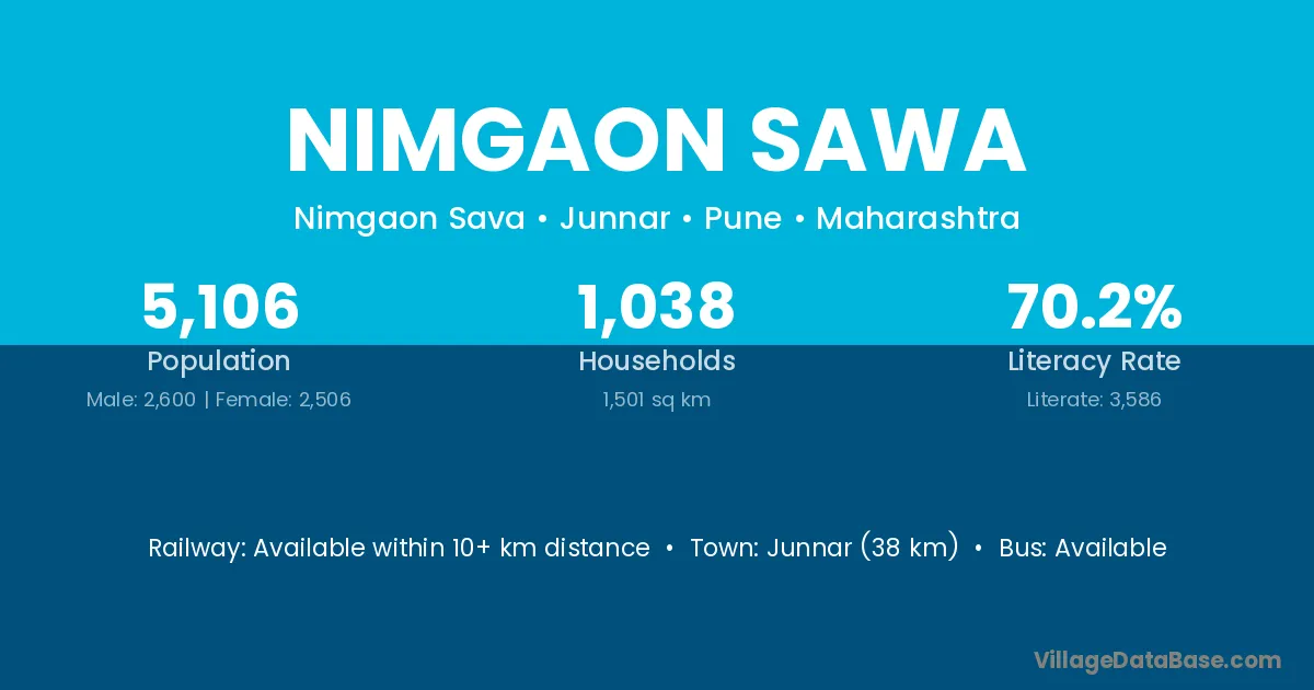 Junnar (38 km) is the nearest town to Nimgaon Sawa village for major economic activities and is located approximately 38 km away.