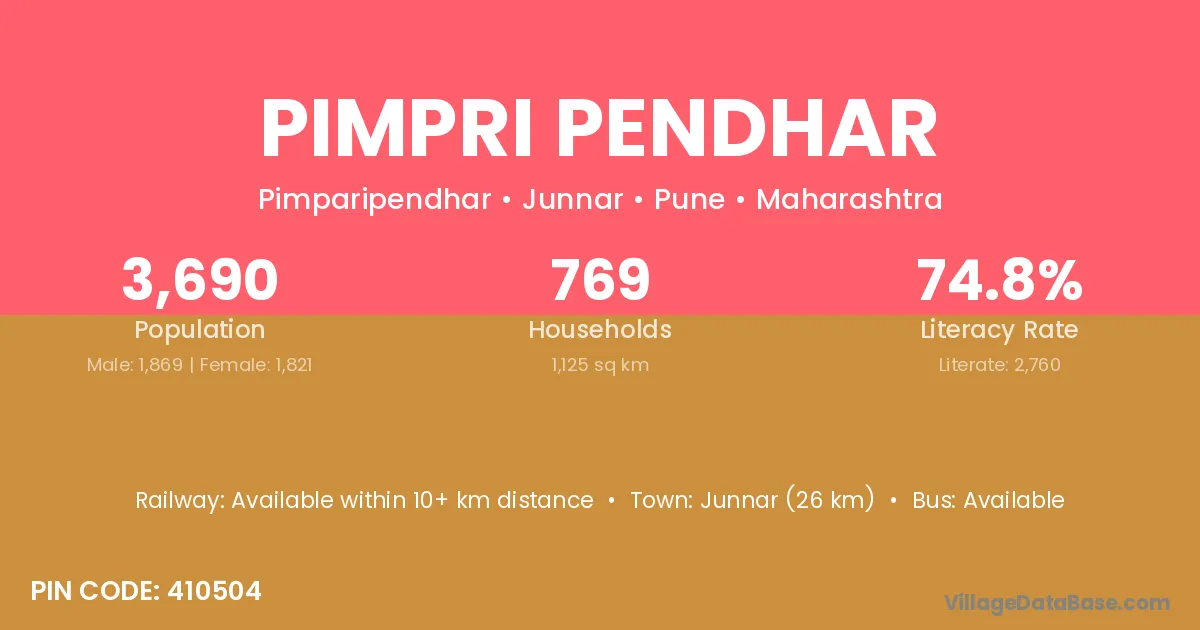 Junnar (26 km) is the nearest town to Pimpri Pendhar village for major economic activities and is located approximately 26 km away.
