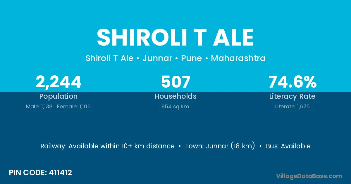 Junnar (18 km) is the nearest town to Shiroli T Ale village for major economic activities and is located approximately 18 km away.