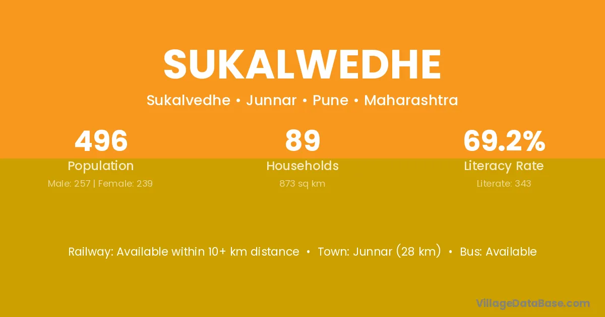 Junnar (28 km) is the nearest town to Sukalwedhe village for major economic activities and is located approximately 28 km away.