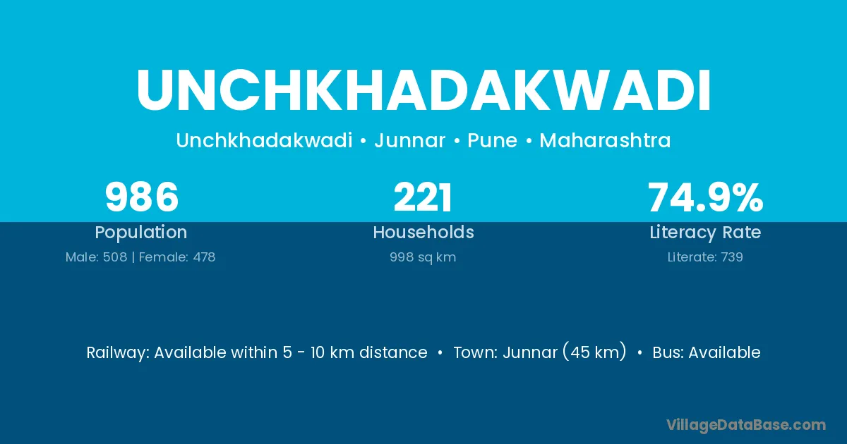 Junnar (45 km) is the nearest town to Unchkhadakwadi village for major economic activities and is located approximately 45 km away.