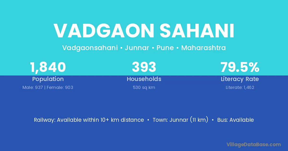 Junnar (11 km) is the nearest town to Vadgaon Sahani village for major economic activities and is located approximately 11 km away.