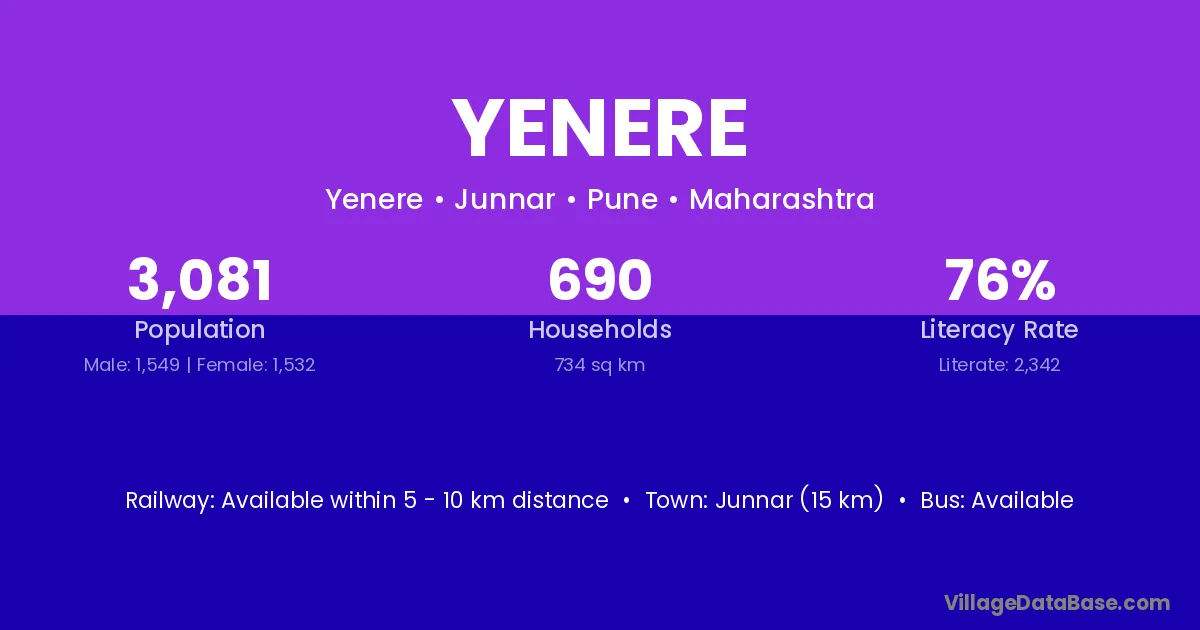 Junnar (15 km) is the nearest town to Yenere village for major economic activities and is located approximately 15 km away.