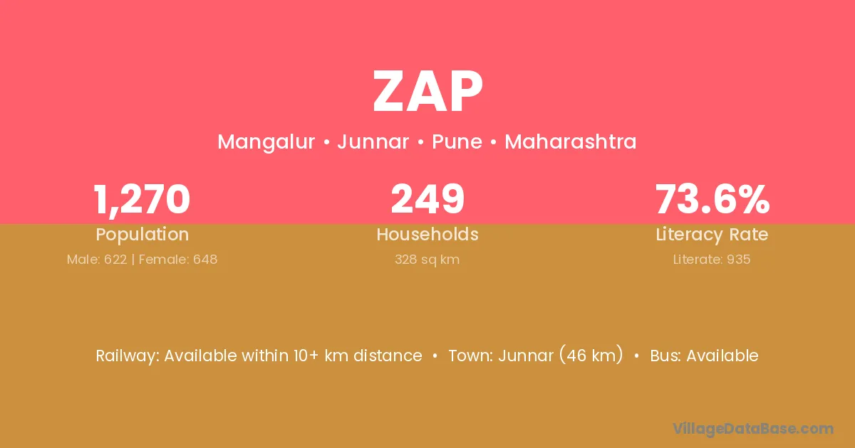 Junnar (46 km) is the nearest town to Zap village for major economic activities and is located approximately 46 km away.