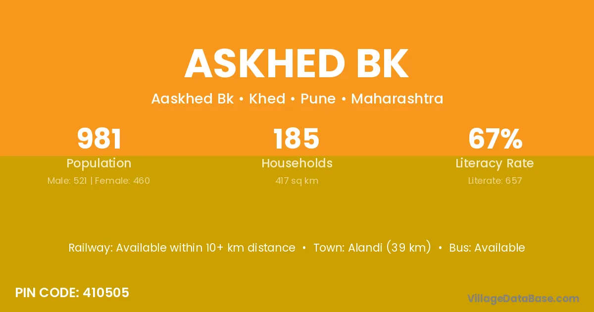 Alandi (39 km) is the nearest town to Askhed Bk village for major economic activities and is located approximately 39 km away.