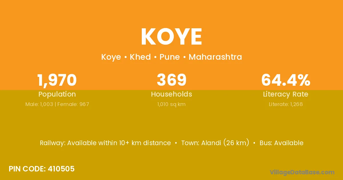 Alandi (26 km) is the nearest town to Koye village for major economic activities and is located approximately 26 km away.