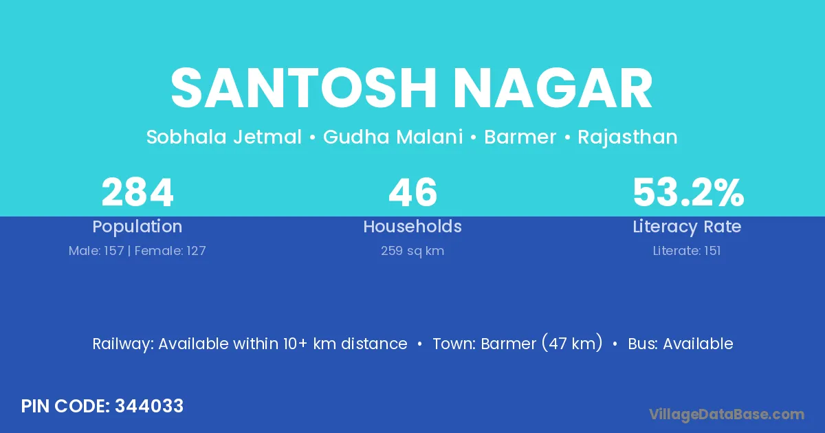The literacy rate of Santosh Nagar village is 68.19%. Male literacy stands at 74.88% and female literacy at 61.24%.